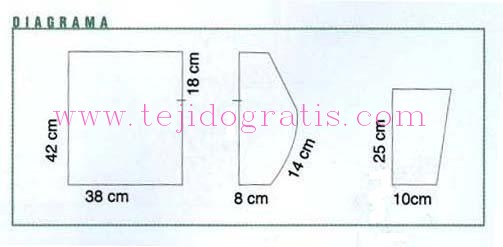 Se teje en una sola pieza las delanteras y la espalda. Hacer una cadena de 50 cm y comenzar el diagrama empezando por 2 varetas y terminando igual, así tejer hasta completar 23 cm. Luego, del lado de la sisa, hacer una cadena de 20cm y continuar tejiendo la parte de la espalda 46 cm más. Luego hacer de lado de la sisa una cadena de 20cm y tejer 23cm más para la otra delantera.